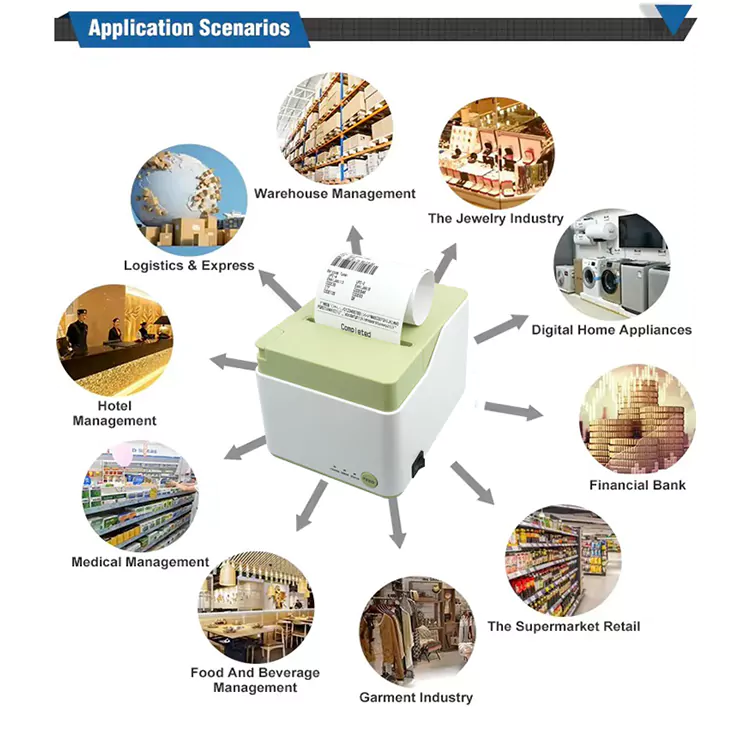 Su velocidad de impresión es de 250 mm/s, con un ancho de impresión efectivo de 72 mm o 64 mm. Admite múltiples códigos de barras, incluidos UPC-A, EAN-13, CODE39 y CODE128, lo que lo hace adecuado para diversas industrias, como catering, grandes almacenes y supermercados.