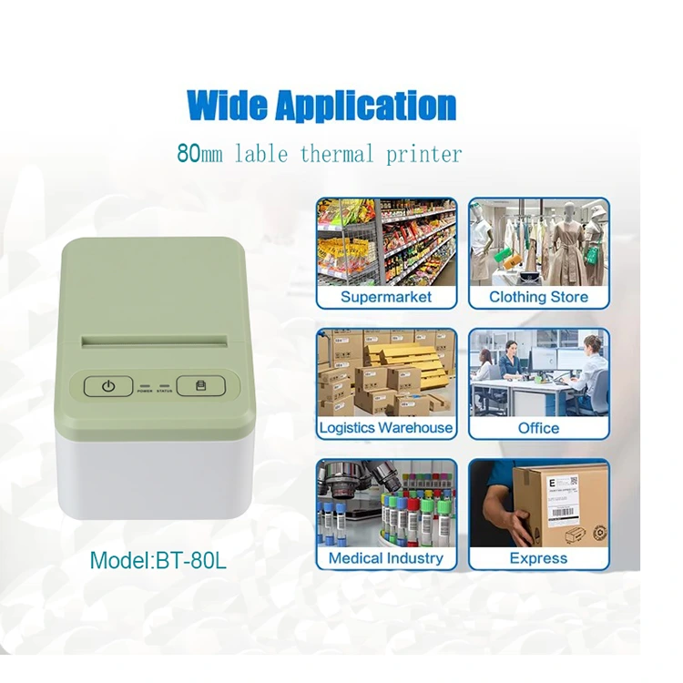 El concepto de diseño de nuestra impresora térmica de etiquetas a color es permitir a los clientes utilizarla en sistemas de almacén de fábrica, pequeñas tiendas minoristas que necesitan imprimir etiquetas pequeñas, códigos de barras, marcas de envío, pegatinas, etc. El modelo 80L puede admitir la impresión en anchos que varían de 20 a 80 mm, lo que lo hace adecuado para varios clientes con diferentes necesidades. Está diseñado para tener un tamaño compacto, lo que lo hace cómodo de transportar y colocar.